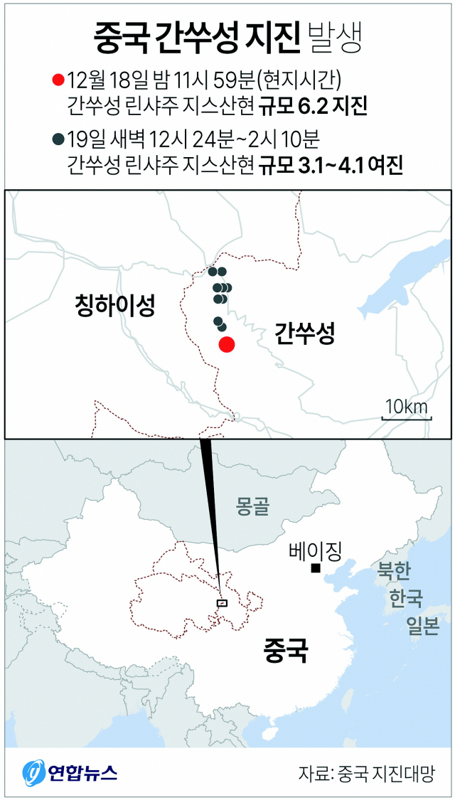 19일 중국 지진대망에 따르면 전날 밤 11시 59분(한국시간 19일 0시 59분) 간쑤성 린샤주 지스산현에서 규모 6.2의 지진이 발생했다. 진앙은 북위 35.70도, 동경 102.79도이며 지진 발생 깊이는 10㎞다. 지진 발생 후 규모 4.0∼4.9 지진 두 차례를 포함해 모두 275차례의 여진이 이어졌다.