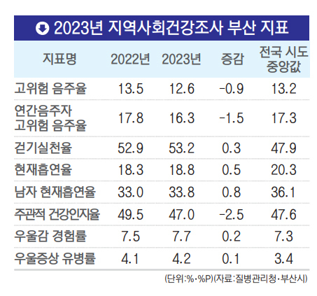 특히 우울감 경험률과 우울증상유병률은 모두 전국 평균보다 높아 특별한 관리가 필요하다는 지적이다. 지난해 기준 전국 14위로 전국 최하위를 기록한 행복감 지수(부산일보 지난 13일 자 1·6면 보도)는 격년 조사로, 이번 지역사회건강조사 지표에 포함되지 않았다.