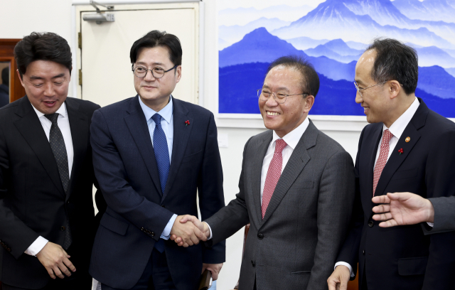 국민의힘 윤재옥 당 대표 권한대행 겸 원내대표와 더불어민주당 홍익표 원내대표가 20일 서울 여의도 국회 운영위원장실에서 2024년도 예산안 합의를 마친 뒤 악수하고 있다. 연합뉴스 제공.