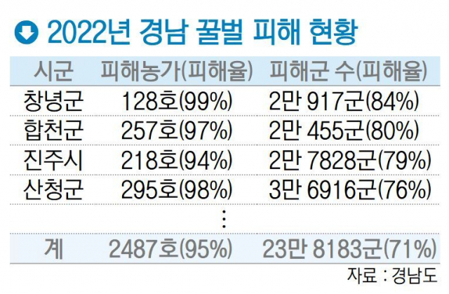 경남도 조사 결과 지난해 도내 전체 농가 가운데 94.8%가 피해를 입었고 70% 넘는 꿀벌이 죽거나 사라졌다. 창녕군과 합천군의 경우 피해 규모가 80%를 넘어섰다. 정확한 원인 파악도 쉽지 않은데 단지 응애와 이상기후, 농약, 말벌 등 복합적인 요인이 작용했을 것이란 분석이 나오고 있다.