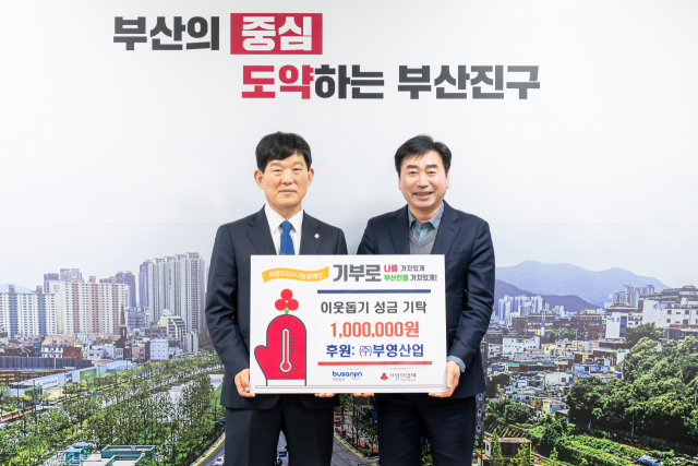 (주)부영산업(회장 이춘우)은 지난 18일 부산진구청에 이웃돕기 성금 100만원을 기탁했다. 기탁한 성금은 부산 사회복지공동모금회를 통해 부산진구 정다운 이웃사촌 복지사업에 사용될 예정이다.
