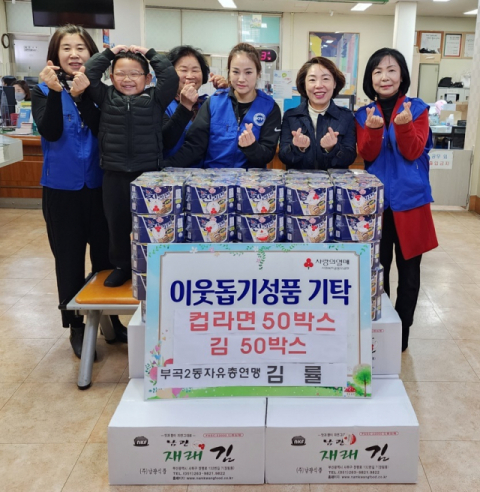 부산 금정구 부곡2동은 지난 14일 부곡2동 자유총연맹에서는 연말을 맞이하여 어려운 이웃을 위해 컵라면 50박스, 김 50박스를 기탁했다고 밝혔다.