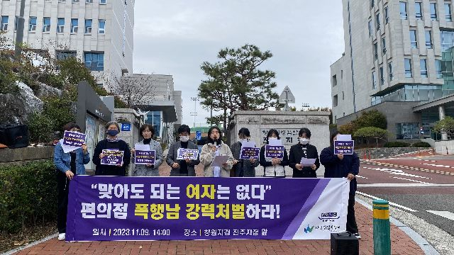 여성의당 경남도당 경남여성회가 지난달 9일 창원지검 진주지청 앞에서 편의점 폭행 피의자에 대한 강력처벌 등을 요구하는 기자회견을 진행했다. 부산일보DB