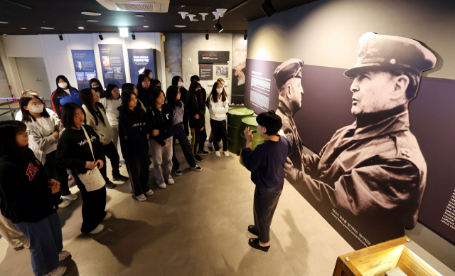 지난달 8일 부산해운대교육지원청의 평화·통일 역사 체험 프로그램에 참가한 학생들이 UN평화기념관에서 한국전쟁과 UN군 등에 대한 설명을 듣고 있다. 정종회 기자 jjh@
