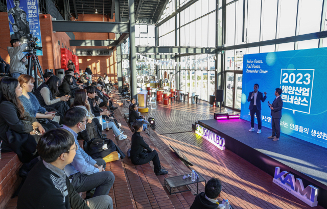 21일 부산 수영구 밀락더마켓에서 열린 2023 해양산업르네상스에 요트국가대표 조원우 씨가 강연을 하고 있다. 이날 행사에는 황의철 해양드론기술 대표, 송건호 링스업 대표, 롯데자이언츠 출신 이대호 선수가 참여했다.