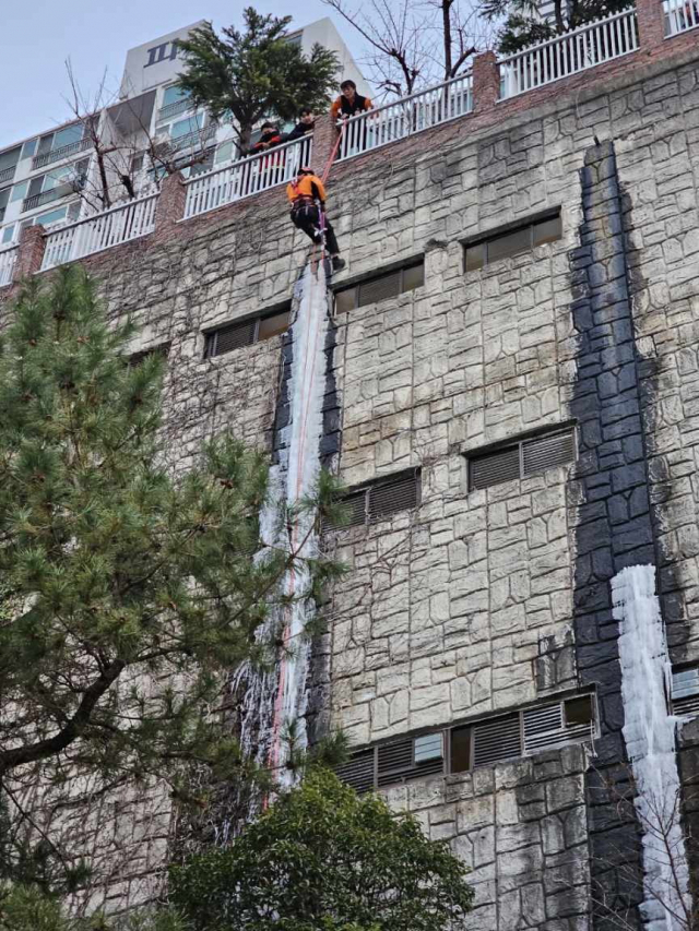 지난 19일 부산 해운대구 재송동 한 아파트 외벽에 60m 길이의 고드름이 맺혀 소방관들이 시민 신고를 받고 출동해 제거 작업을 벌였다. 부산소방재난본부 제공