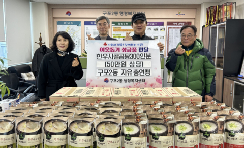 부산 북구 구포2동 행정복지센터는 구포2동 자유총연맹(회장 천남용)에서 어려운 이웃을 위해 50만원 상당의 한우사골곰탕 300인분을 기탁했다고 밝혔다.