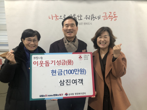 신정수 금곡동장은 “연말에 어려운 이웃을 위해 따뜻한 마음을 전해준 삼진여객에 감사드리며, 지역의 어려운 이들을 위해서 잘 쓰겠다.” 고 밝혔다.