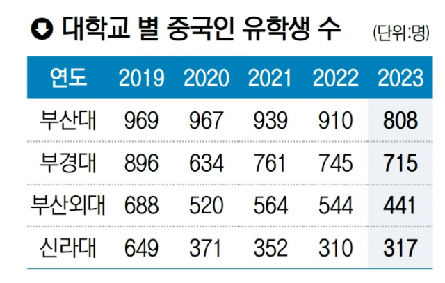25일 부산대, 국립부경대, 부산외국어대, 신라대 등에 따르면, 올해 이들 4개 대학의 중국 유학생은 모두 2281명이다. 2019년엔 3202명이었으니 4년 새 1000명가량 줄었다. 이는 코로나19 팬데믹으로 하늘길이 막히고 한중 관계가 악화됐기 때문으로 풀이된다.