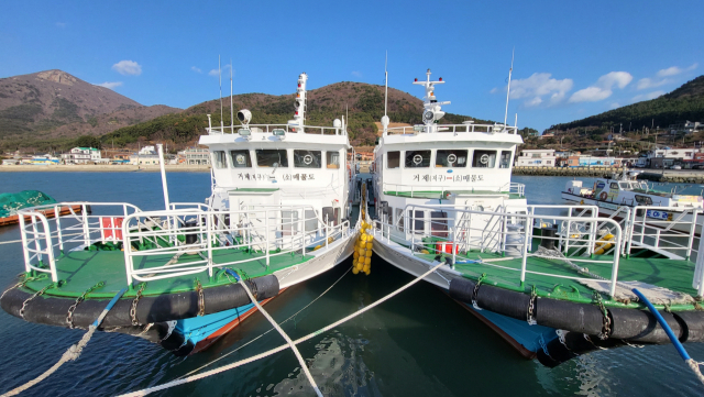 거제시 남부면 저구항에 발이 묶인 매물도해운 소속 여객선 2척. 김민진 기자