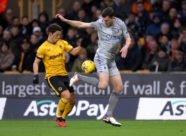 울버햄프턴의 황희찬이 31일(한국시간) 에버턴과 홈 경기에서 상대 선수와 볼 경합을 하고 있다. 로이터연합뉴스