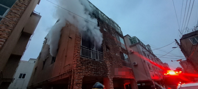 지난 30일 오후 울산시 남구 한 원룸 건물에서 불이 나 연기가 건물 창문을 통해 쉴 새 없이 뿜어져 나오고 있다. 울산소방본부 제공