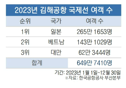 김해공항 여객 회복은 일본노선이 이끌었다. 한국공항공사 부산본부가 집계한 결과에 따르면 국제선 여객 649만 7410명 중 일본노선 여객이 265만 1653명으로 40.8%를 기록했다. 김해공항 국제선 항공여객 10명 중 4명이 일본노선을 이용한 셈이다. 2위는 베트남(143만 1029명), 3위는 대만(62만 3444명) 노선으로 나타났다.