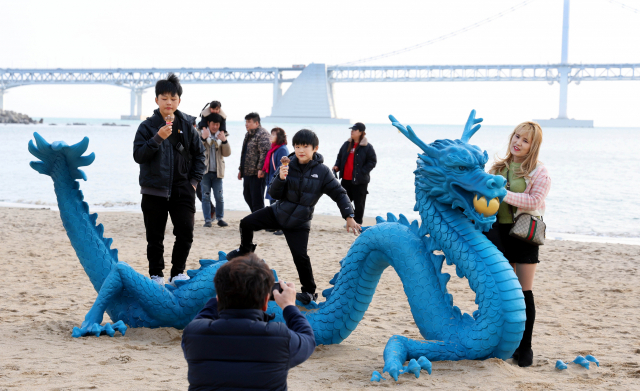 휴일인 31일 오후 부산 수영구 광안리해수욕장에서 시민들이 2024년 갑진년 새해를 맞아 설치된 청룡 조형물 앞에서 사진을 찍고 있다. 수영구청이 설치한 이 조형물은 높이 1.8m, 길이 3m로 청룡이 황금 여의주를 품은 모습이다.