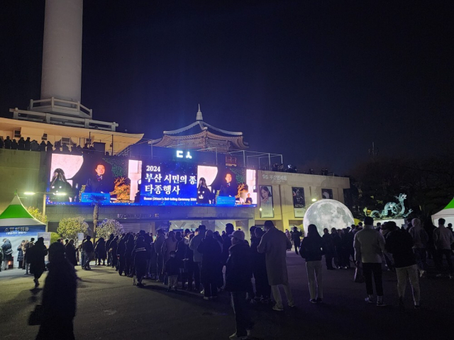 1일 부산시와 경찰 등에 따르면, 중구 용두산공원에서 열린 ‘부산 시민의 종 타종 행사’가 이날 0시 30분께 끝났다. 타종은 선행 시민, 의인, 청년대표 등 22명이 담당했다. 시는 부산을 대표하는 자랑스러운 시민, 항저우 아시안 게임 금메달 수상자, 시민 영웅 등 희망과 사랑의 가치를 몸소 실천한 인물들을 선정했다. 이들은 희망, 사랑, 평화 3개 조로 나뉘어 조마다 11회씩 종을 쳐 모두 33회 타종하며 새해 출발을 알렸다.