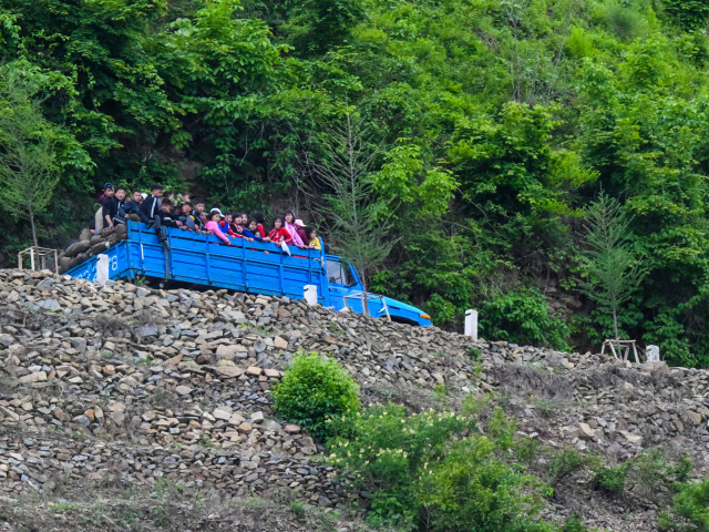북한 어린이들이 트럭을 타고 농촌동원을 가는 장면. 강동완 제공