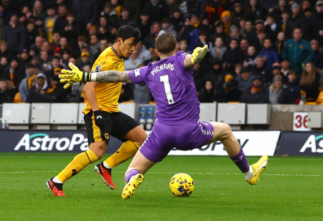 울버햄프턴의 황희찬이 EPL 20라운드 에버턴과 홈 경기에서 상대 골키퍼를 제치며 골 찬스를 엿보고 있다. 로이터연합뉴스