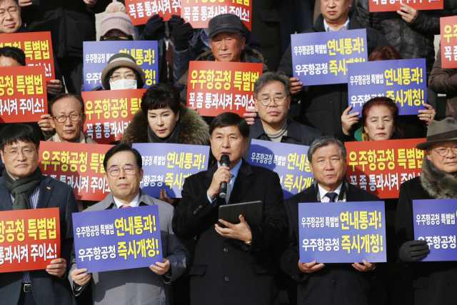 지난달 26일 국회 본청 앞에서 경상남도상공회의소협의회 주최로 열린 우주항공청 특별법 연내 통과 촉구 기자회견에서 최재호 경상남도상공회의소협의회장이 발언하고 있다. 연합뉴스