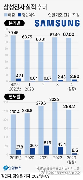 삼성전자는 연결 기준 작년 한 해 영업이익이 6조 5400억 원으로 전년보다 84.9% 감소한 것으로 잠정 집계됐다고 9일 공시했다. 매출은 258조 1600억 원으로 전년 대비 14.6% 줄어들었다.