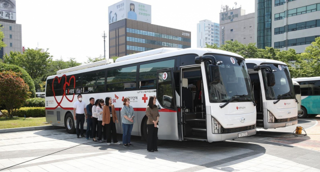 울산시청 마당에 헌혈 차량이 배치돼 직원들이 헌혈에 동참하고 있다. 울산시 제공