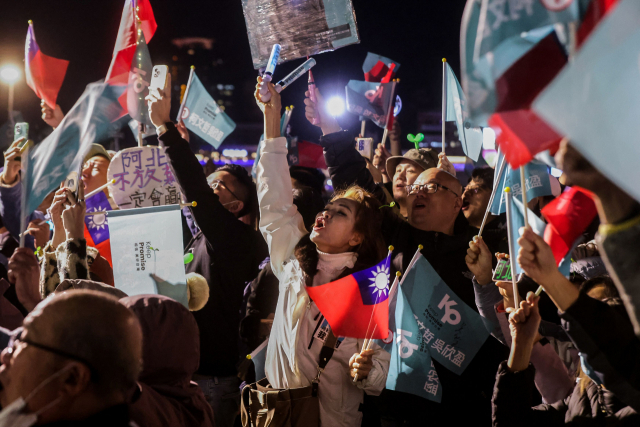 대만 제2야당 대만민중당(민중당) 지지자들이 10일 지룽에서 열린 선거 유세 중 청천백일만지홍기(청천백일기)와 민중당 깃발을 흔들고 있다. 오는 13일 치러지는 대만 총통 선거에는 친미 성향 집권 민주진보당(민진당)의 라이칭더 후보, 친중 제1야당 국민당의 허우유이 후보, 민중당의 커원저 후보 등 3명이 출마했다. 연합뉴스