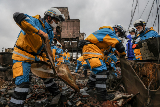 일본 혼슈 이시카와현에서 규모 7.6의 강진이 발생한 지 열흘 째인 10일 현지 구조단원들이 와지마 시내에서 잔해 더미를 치우며 실종자를 찾고 있다. AFP연합뉴스