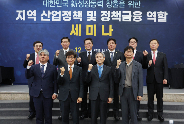 지난달 12일 부산상공회의소 상의홀에서 열린 ‘대한민국 신성장동력 창출을 위한 지역 산업정책 및 정책금융 역할 세미나’에서 박형준 부산시장과 강석훈 산업은행 회장, 세미나 발제자 등이 기념사진을 찍고 있다. 정종회 기자 jjh@