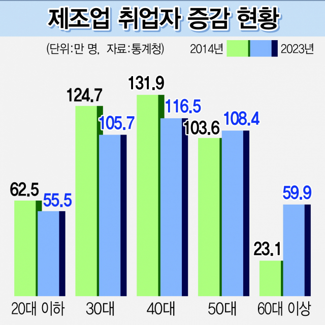 그러나 경제 주축이 되는 30대와 40대는 큰 폭으로 감소했다. 30대는 이 기간에 124만 7000명에서 105만 7000명, 40대는 131만 9000명에서 116만 5000명으로 각각 줄었다. 특히 지난해 20대 제조업 취업자 수는 54만 5000명으로, 20대 숙박·음식점업 취업자 수(57만 4000명)에 밀렸다. 이는 서비스업 시장 규모가 과거에 비해 커진 영향도 크다. 여기에 청년들이 중소기업을 기피하는 현상이 여전하다는 것이 전문가들의 지적이다.