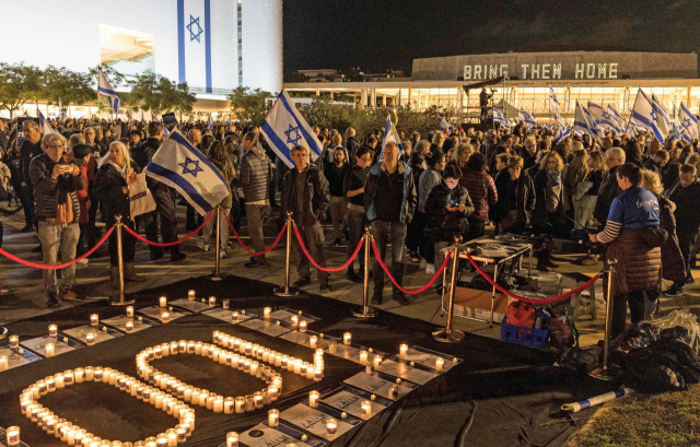지난해 10월 7일 팔레스타인 무장정파 하마스의 이스라엘 기습 공격으로 시작된 전쟁이 개전 100일째를 맞이한 가운데 13일(현지 시간) 이스라엘 텔아비브에서 시민들이 촛불로 숫자 100을 만들고 평화를 기원하는 반전시위를 하고 있다. AFP연합뉴스