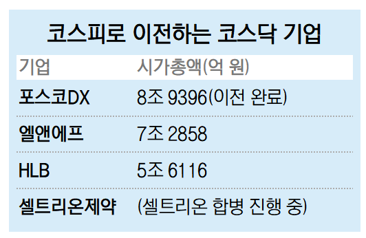 시총 3위인 셀트리온헬스케어는 셀트리온과 합병이 이뤄지고 시총 4위인 포스코DX도 이전 상장 절차를 지난해 말 마치고 지난 2일부터 코스피 기업으로 거래가 이뤄지고 있다. 지난달 21일 코스닥 시가총액 6위인 HLB는 임시 주주총회를 열고 이전 상장을 확정했다. 코스피로 이전하는 4개 기업 시총을 합하면 약 35조 원에 이른다. 코스닥 전체 시가총액이 426조 원인데 전체 코스닥 시장의 9%다.