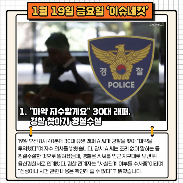 1. "마약 자수할게요" 30대 래퍼, 경찰 찾아가 횡설수설