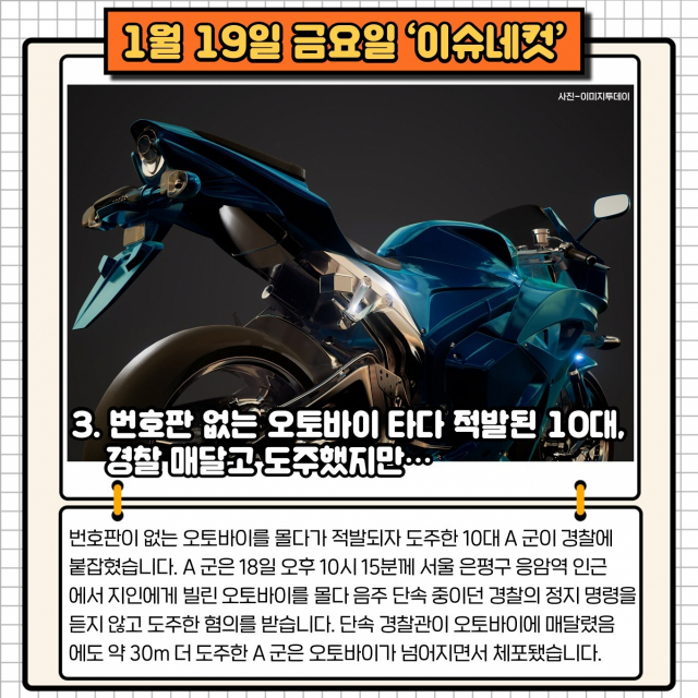 3. 번호판 없는 오토바이 타다 적발된 10대, 경찰 매달고 도주했지만…