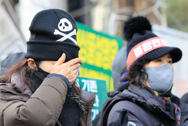 19일 오후 서울 영등포구 여의도 금융감독원 앞에서 홍콩H지수(항셍중국기업지수) 기초 주가연계증권(ELS) 투자자들이 피해 보상 등을 촉구하는 가운데 한 집회 참가자가 삭발식을 보며 눈물을 흘리고 있다. 연합뉴스