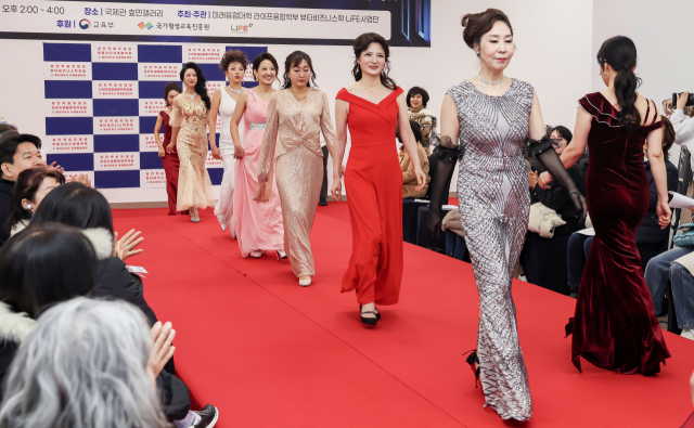 부산 부산진구 동의대학교 국제관에서 23일 열린 지역 주민 초청 시니어 모델 원데이 클래스 ‘나도 런웨이 스타가 되다’에서 시니어 모델들이 워킹을 하고 있다. 이번 행사는 동의대 미래융합대학이 시민 평생교육 프로그램의 하나로 진행했다. 김종진 기자 kjj1761@