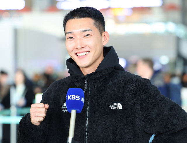 전지훈련을 위해 독일로 출국하는 ‘스마일 점퍼’ 우상혁이 지난 5일 오전 인천국제공항 제1여객터미널 출국장에서 취재진과 인터뷰하고 있다. 연합뉴스
