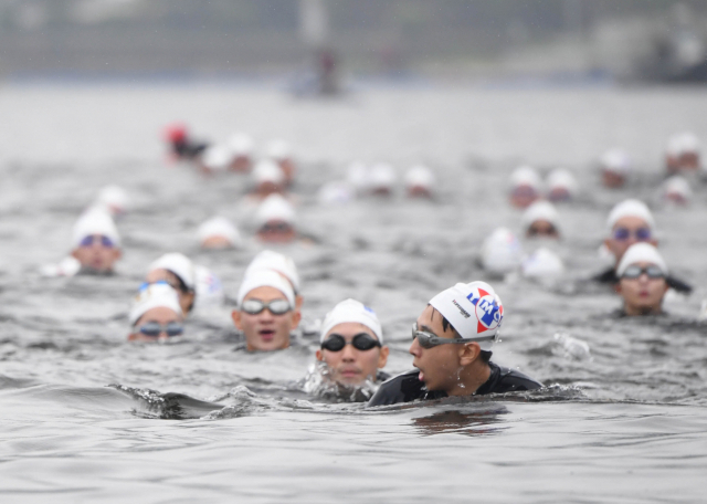 해군사관학교 생도들이 해군사관학교 앞 해상에서 전투수영 훈련을 하는 모습. 해군 제공