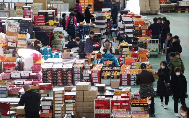 설 명절을 앞두고 마지막 휴일인 4일 부산 해운대구 반여농산물도매시장에서 시민들이 선물과 차례 등에 사용할 과일을 고르고 있다. 정종회 기자 jjh@