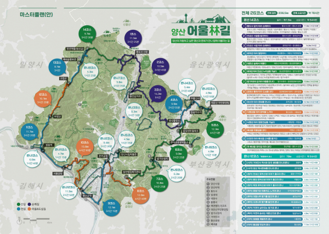 세부적으로 보면 양산 어울림길은 산과 마을을 잇고, 산과 강·하천을 엮고, 사람들이 오가며 양산의 문화를 경험하고 체감할 수 있는 본선 14개 코스 157.5km와 특화 12개 코스 79km 등 총 26개 코스 236.5km를 연결한다.
