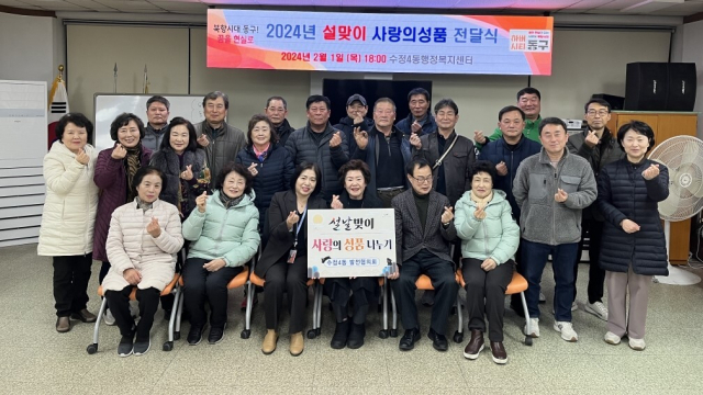 부산 동구(구청장 김진홍) 수정4동 발전협의회(회장 서옥선)는 지난 1일 설을 앞두고 어려운 이웃들과 함께 행복한 명절을 맞이하기 위해 사랑의 성품 나누기 전달식을 가졌다.