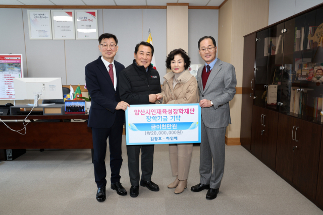 경남 양산 시내버스 업체 (주)세원 김창호 대표와 부인 하인애 씨가 7일 지역 인재 육성에 써달라며 양산시 인재육성장학재단에 2000만 원을 기탁했다.