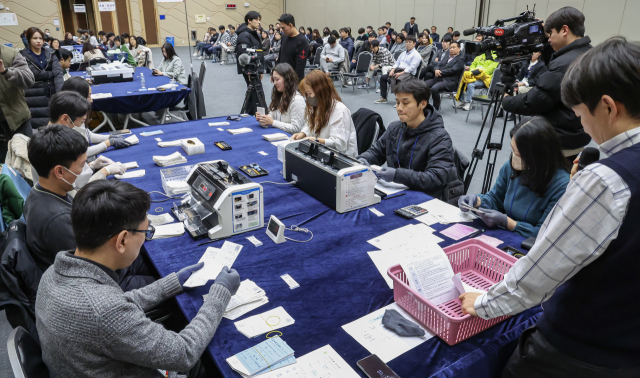 제22대 국회의원 선거를 두 달여 앞둔 7일 부산 동구 부산항국제전시컨벤션센터에서 부산시 선거관리위원회와 구·군 선관위 직원들이 실제 선거에 대비한 모의 개표 실습을 진행하고 있다.