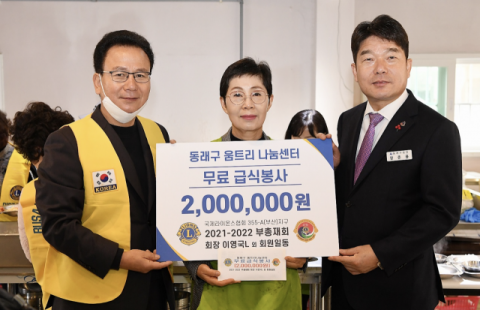 부산 동래구(구청장 장준용)는 지난 6일 국제라이온스협회 355-A(부산)지구 2021-2022 부총재회(회장 이영국)에서 온천동 소재 움트리나눔센터(대표 김양애)에 무료급식 봉사와 성금(200만 원)을 전달했다고 밝혔다. 사단법인 움트리나눔센터는 이웃과 더불어 사는 따뜻한 사회를 만드