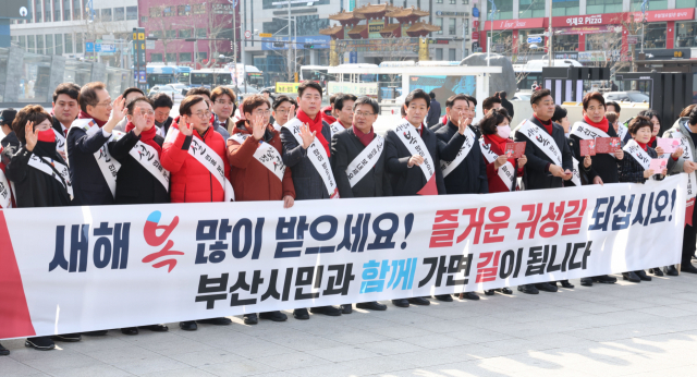 국민의힘 부산시당 국회의원과 주요 당직자들이 8일 오후 부산 동구 부산역에서 설 귀성인사를 하고 있다. 정대현 기자 jhyun@
