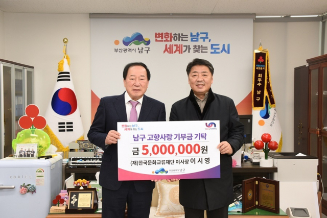 부산 남구(구청장 오은택)는 8일 (재)한국문화교류재단 이시영 이사장이 500만 원을 기부해 고향사랑기부 제7호 고액기부자로 이름을 올렸다.