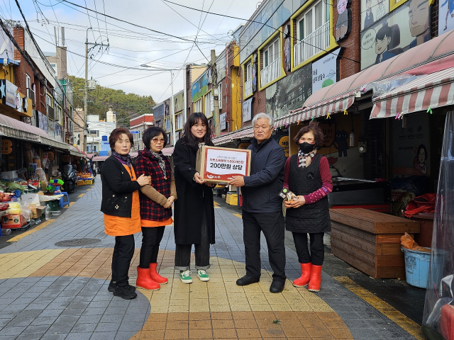 (주)SOO(대표 황득규)에서는최근 화재에 취약한 동구 좌천동 성북전통시장을 찾아 붙이는 자동 소화기(200만 원 상당)를 전달했다.