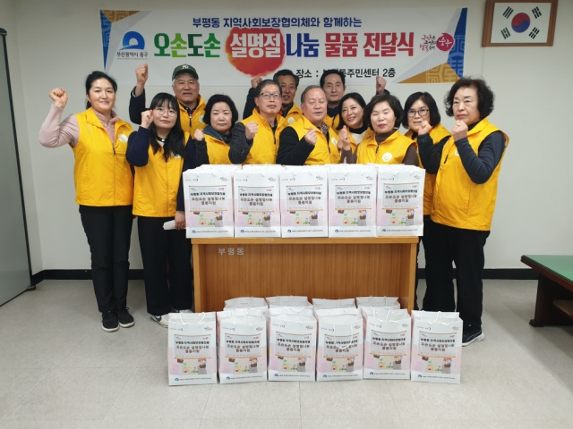 부산 중구 부평동(동장 이성택)은 지난 7일 부평동지역사회보장협의체(민간위원장 양말출)와 함께 ‘오손도손 설 명절 나눔’ 물품 전달식을 가졌다.