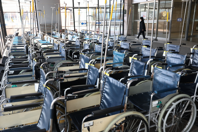 정부의 의대 정원 확대 정책에 반대하는 의사들이 설 연휴 이후 집단행동을 준비하는 가운데 12일 서울의 한 대학 병원에 빈 휠체어들이 세워져 있다. 연합뉴스