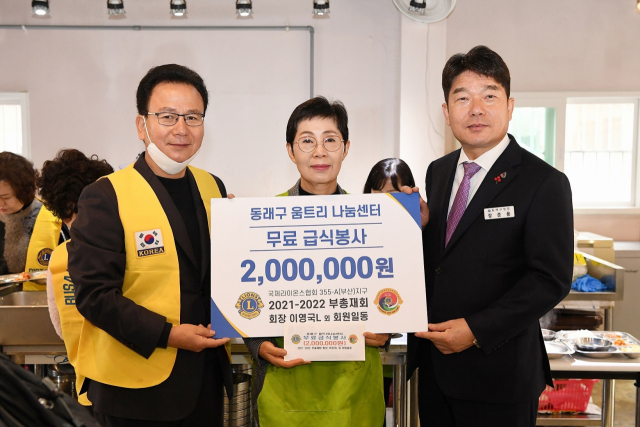 국제라이온스협회 355-A(부산)지구 2021-2022 부총재회(회장 이영국)는 최근 부산 동래구 움트리나눔센터(대표 김양애)를 방문해 무료급식 봉사와 성금 200만 원을 전달했다.