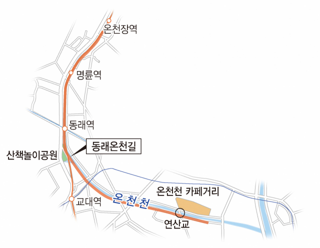 부산도시철도 온천장역에서 명륜역, 동래역을 지나 온천천 카페거리까지 이어지는 동래온천길은 산책하기 좋아 사시사철 사람들로 붐빈다. 무엇보다 계절이 오는 소리를 듣고 싶다면 온천천만한 곳이 없다. 봄에는 벚꽃와 유채꽃이 만개해 장관을 이루고, 푸르른 녹음의 계절 여름, 노랗거나 붉게 물드는 가을, 고즈넉하면서도 차분한 겨울까지 사계절이 주는 다양한 매력을 느낄 수 있다.