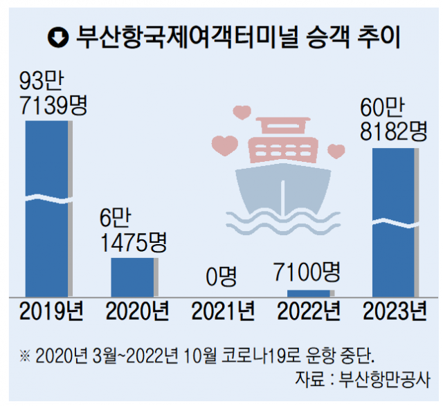 13일 부산항만공사(BPA)에 따르면 지난해 여객터미널을 이용한 승객 수는 60만 8182명으로 코로나 이전인 2019년(93만 7139명)의 3분의 2 수준까지 회복했다. 코로나19 유행으로 끊겼던 부산~일본 뱃길이 2022년 11월부터 서서히 열렸다는 점을 고려하면, 짧은 시간에 여객 수요가 극적인 회복세를 보인 셈이다. 2015년 8월 개장한 여객터미널은 일본 대마도, 후쿠오카, 시모노세키, 오사카 등 총 4개 노선을 운영 중이다. 총 5개 선사가 7개 선박을 운항하고 있다.